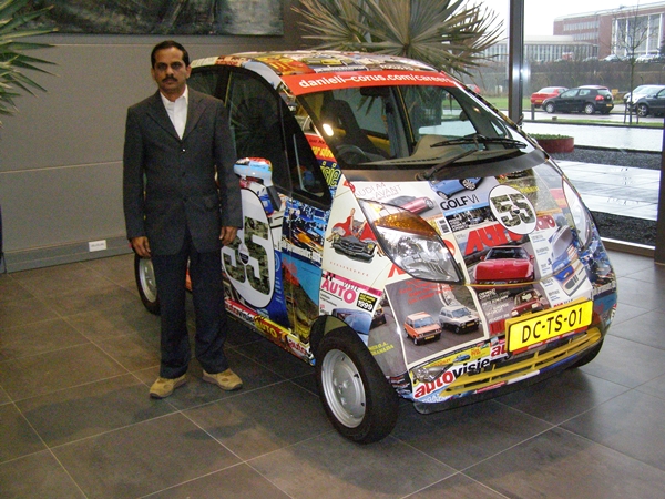 నానో కారును చూడటంలో పెద్ద వింతేముంది.. ప్రతి రోడ్లపై బోలెడు నానో కార్లు కనిపిస్తుంటాయ్ అని లైట్గా తీసిపారేయకండి. నెల్లూరులో ఓ తెలుగు వ్యక్తిని కలవడం మామూలే కానీ అదే నెథర్లాండ్స్లో ఓ తెలుగు వ్యక్తి కనబడితే మన ఆనందానికి హద్దులు ఉండవు. అలాంటిదే ఈ కారు కూడా..! కర్ణాటక రాష్ట్రంలోని బళ్లారి జిల్లాలో ఉన్న జెఎస్డబ్ల్యూ స్టీల్ ప్లాంటులో పనిచేస్తున్న అరుణ్ ఉడుపా అనే ఓ అధికారి తాజాగా కంపెనీ పనిమీద నెథర్లాండ్స్ వెళ్లినప్పుడు డానియేలి కోర్స్ ఆఫీసులో ఈ కారును చూశారు.