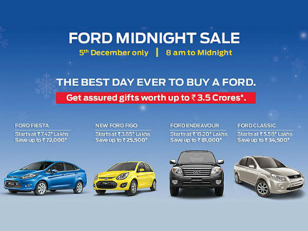 (పైన పేర్కొన్న అన్ని ధరలు కూడా ఎక్స్-షోరూమ్, ఢిల్లీ). దేశవ్యాప్తంగా ఉన్న అన్ని ఫోర్డ్ ఇండియా అధీకృత షోరూమ్లు డిసెంబర్ 5, 2012 బుధవారం రోజున ఉదయం 8 గంటల నుండి అర్థరాత్రి వరకూ తెరచి ఉంటాయని కంపెనీ తెలిపింది. ఆ రోజు ఫోర్డ్ కారును బుక్ చేసుకున్న వారికి ప్రత్యేక తగ్గింపులతో పాటు, ఆకర్షనీయమైన వడ్డీ రేట్లు, రూ.3.5 కోట్ల వరకూ విలువైన అశ్శూర్డ్ బహుమతులు గెలుచుకునే అవకాశాలున్నాయని ఫోర్డ్ ఇండియా ఓ ప్రకటనలో పేర్కొంది. మరింకెందుకు ఆలస్యం, బుధవారం రోజున ఫోర్డ్ షోరూమ్కి వెళ్లి మీ డ్రీమ్ కారును సొంతం చేసుకునేందుకు సిద్ధంకండి.