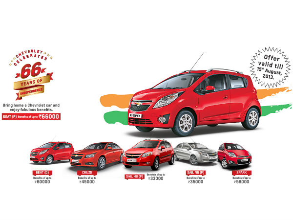 స్వాతంత్ర్య దినోత్సవాన్ని పురస్కరించుకొని, ప్రముఖ ఆటోమొబైల్ కంపెనీ జనరల్ మోటార్స్ ఇండియా, దేశీయ విపణిలో అందిస్తున్న చెవర్లే వాహనాలపై భారీ డిస్కౌంట్లను ఆఫర్ చేస్తోంది. వివిధ చెవర్లే కార్లపై రూ.66,000 వరకు తగ్గింపులను కంపెనీ అందిస్తోంది.