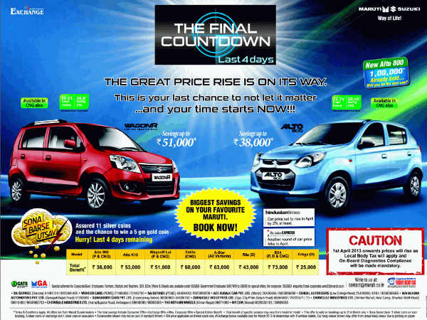 మారుతి సుజుకి అందిస్తున్న దాదాపు అన్ని కార్లపై భారీ డిస్కౌంట్లు లభిస్తున్నాయి. కొన్ని ప్రాంతాల్లో డీలర్లు స్విఫ్ట్, డిజైర్ మోడళ్లపై డిస్కౌంట్లను ఆఫర్ చేస్తూ, ఎలాంటి వెయిటింగ్ పీరియడ్ లేకుండానే వీటిని అందిస్తున్నారు. సరసమైన ధరకే మారుతి కారును సొంతం చేసుకోవాలనువారికి ఇదే సరైన సమయం. మరిన్ని వివరాల కోసం మీ సమీపంలోని మారుతి సుజుకి అధీకృత డీలరును సంప్రదించండి.