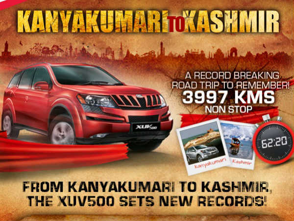 కారులో ఎవరైనా భారతదేశంలోని ఈ చివరి ఆ చివరి వరకు 62 గంటల్లో వెళ్లగలరా..? అసాధ్యం అంటారా..! కానీ సాధ్యమైంది. దేశీయ యుటిలిటీ వాహన దిగ్గజం మహీంద్రా అండ్ మహీంద్రా బృందం తమ పాపులర్ ఎక్స్యూవీ500 ఎస్యూవీలో కేవలం 62 గంటల 20 నిమిషాల వ్యవధిలో కన్యాకుమారి నుంచి కాశ్మీర్ వరకు నిరంతరాయంగా మొత్తం 3997 కిలోమీటర్ల దూరం ప్రయాణించి సరికొత్త రికార్డును సృష్టించారు.