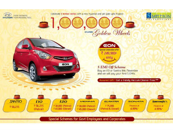 హ్యుందాయ్ ఇయాన్పై కంపెనీ ప్రత్యేక ఆఫర్ అందిస్తోంది. స్పెషల్ సెలబ్రేషన్ ఆఫర్లో భాగంగా ఈ కారును కేవలం రూ.2,49,900 ప్రారంభ ధరకే ఆఫర్ చేస్తోంది. అలాగే ఈ నవంబర్ నెలలో ఫైనాన్స్ ద్వారా ఐ10 లేదా శాంత్రో కారును కొనుగోలు చేసిన కస్టమర్లకు తొలి ఐదు ఈఎమ్లను కంపెనీయే చెల్లిస్తుంది. ఈ నెలలో హ్యుందాయ్ కారు కొనేవారికి అష్షూర్డ్ గిఫ్ట్ను కూడా కంపెనీ అందిస్తోంది.