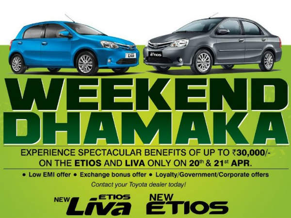 'వీకెండ్ ధమాకా' పేరుతో టొయోటా వచ్చే వారంతంలో (ఏప్రిల్ 20, 21వ తేదీలలో) ఎతియోస్, లివా కార్లపై వివిధ ఆఫర్లను అందిస్తోంది. ఈ రెండు రోజుల్లో టొయెటా ఎతియోస్ సెడాన్, టొయోటా ఎతియోస్ లివా కార్లను కొనుగోలు చేసే కస్టమర్లకు తక్కువ ఈఎమ్ఐ ఆఫర్, ఎక్సేంజ్ బోనస్ ఆఫర్, లాయల్టీ/కార్పోరేట్/గవర్నమెంట్ బోనస్లను అందిస్తున్నట్లు కంపెనీ ఓ ప్రకటనలో పేర్కొంది.
