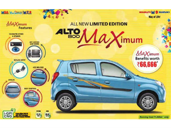 మారుతి సుజుకి ఆల్టో 800 మాగ్జిమ్ లిమిటెడ్ ఎడిషన్లో ఆర్ట్ లెథర్ సీట్ కవర్స్, ఆడియో సిస్టమ్, సైడ్ మోల్డింగ్స్, కీలెస్ ఎంట్రీ, రియర్ రూఫ్ స్పాయిలర్, ఆకర్షనీయమైన బాడీ గ్రాఫిక్స్ వంటి అదనపు ఫీచర్లు లభిస్తాయి. ఈ లిమిటెడ్ ఎడిషన్ కొనుగోలుపై కస్టమర్లు రూ.66,666 వరకు బెనిఫిట్లను పొందవచ్చు.