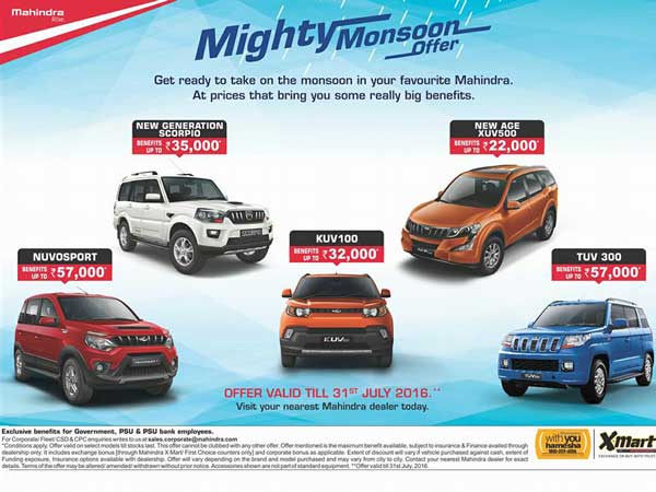 భారతదేశపు వాహన తయారీ దిగ్గజం మహీంద్రా అండ్ మహీంద్రా వారు ఇండియన్ మార్కెట్లోకి 2016 మైటీ మాన్సూన్ ఆఫర్ల పేరుతో తమ ఎస్యువి శ్రేణిలో ఉన్న ఎంచుకోదగ్గ ఉత్పత్తుల మీద భారీ ఆఫర్లు మరియు డిస్కౌంట్లను ప్రకటించింది. జూలై 31, 2016 వరకు మాత్రమే అందుబాటులో ఉండనున్నట్లు మహీంద్రా తెలిపింది. ఆఫర్లు మరియు డిస్కౌంట్ల వివరాల కోసం క్రింది స్లైడర్ల మీద ఓ లుక్కేసుకోండి.