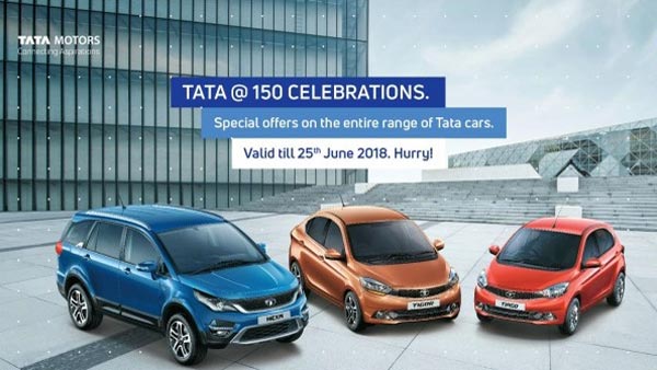 టాటా గ్రూపు 150 సంవత్సరాలు పూర్తి చేసుకున్న సందర్భంగా టాటా మోటార్స్ తమ అన్ని కార్లు మరియు ఎస్యూవీల మీద గరిష్టంగా లక్ష రుపాయల విలువైన పరిమిత కాలపు ఆఫర్లు మరియు డిస్కౌంట్లను ప్రకటించింది.