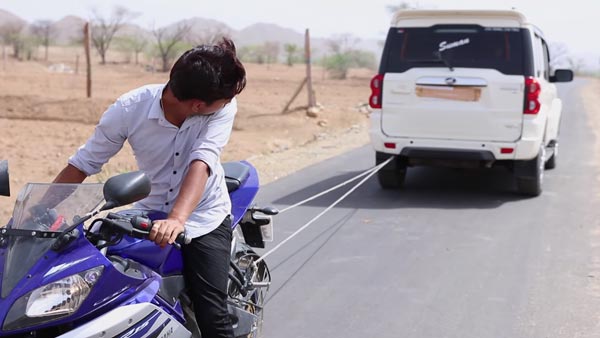 మహీంద్రా స్కార్పియో సుమారుగా 2510 కిలోల బరువును కలిగి ఉంది. మరోవైపు, ఆర్15 వి2, ఒక అతి చురుకైన బైక్ మరియు 136 కిలోల బరువు ఉంటుంది. ఇప్పుడు యమహా ఆర్15 వి2 ద్వారా ఈ ప్రయత్నం యొక్క ఫలితం ఏమిటో చూద్దాం.