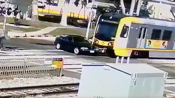 పోలీసుల కథనం మేరకు బ్లాక్ బిఎమ్డబ్ల్యూ కారు వేగంగా రైల్వే క్రాసింగ్ను దాటుతోంది. ఆ సమయంలో వేగంగా వెళ్తున్న ట్రైన్ కారుని ఢీ కొట్టింది. కానీ అదృష్టవ శాత్తు కారు డ్రైవర్ స్వల్ప గాయాలతో బయట పడ్డాడు. డ్రైవర్ ని హాస్పిటల్ కి తరలించారని తెలిపారు.
