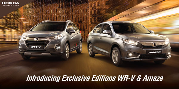 హోండా కార్స్ ఇండియా లిమిటెడ్ దేశీయ మార్కెట్లో విక్రయిస్తున్న ఎంట్రీ లెవల్ సెడాన్ అమేజ్ మరియు ఎస్యూవీ డబ్ల్యుఆర్-వి మోడళ్లలో కంపెనీ కొత్త స్పెషల్ ఎడిషన్ వేరియంట్లను ప్రవేశపెట్టింది. హోండా 'ఎక్స్క్లూజివ్ ఎడిషన్' పేర్లతో మార్కెట్లో విడుదలైన ఈ మోడళ్ల ధరలు వరుసగా ర .7.96 లక్షలు (అమేజ్), రూ.9.70 లక్షలు (డబ్ల్యుఆర్-వి)గా ఉన్నాయి అన్ని ధరలు ఎక్స్-షోరూమ్ (ఢిల్లీ).