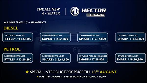 భారతదేశంలో ప్రసిద్ధి చెందిన వాహన తయారీదారు ఎంజీ మోటార్ ఇండియా తన సరికొత్త హెక్టర్ ప్లస్ ఎస్యూవీని దేశీయ మార్కెట్లో విడుదల చేసింది. ఈ కొత్త ఆరు సీట్ల హెక్టర్ ప్లస్ ఎస్యూవీ దేశంలో బ్రాండ్ యొక్క లేటెస్ట్ మోడల్. ఎంజి హెక్టర్ ప్లస్ యొక్క ప్రారంభ ధర రూ. 3.48 లక్షలు(ఎక్స్-షోరూమ్, ఇండియా).