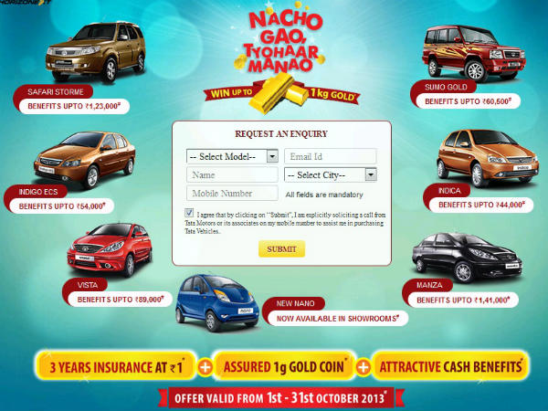 ఈ ఆఫర్ అక్టోబర్ 1, 2013వ తేది నుంచి అక్టోబర్ 31, 2013 వరకు అమల్లో ఉంటుంది. ఈ ఆఫర్లో భాగంగా, కార్లపై తగ్గింపులను అందించడమే కాకుండా, 3 ఏళ్ల ఇన్సూరెన్స్ను కేవలం ఒక్క రూపాయికే కంపెనీ అందిస్తోంది. అంతేకాకుండా, 1 గ్రాము అష్షూర్డ్ గోల్డ్ కాయిన్ను మరియు ఆకర్షనీయమైన నగదు బహుమతులను అందిస్తోంది. వివిధ కార్లపై టాటా మోటార్స్ అందిస్తున్న ఆఫర్ల వివరాలు క్రింది విధంగా ఉన్నాయి.