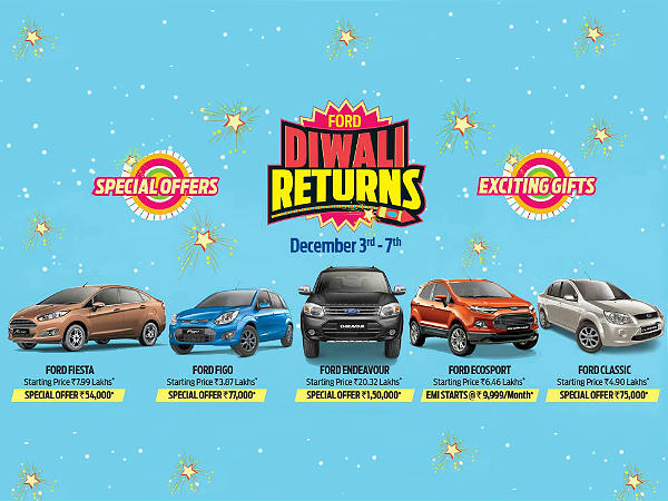 ఫోర్డ్ దీవాళి రిటర్న్స్ క్యాంపైన్ డిసెంబర్ 3 నుంచి 7వ తేదీ వరకూ మాత్రమే అందుబాటులో ఉంటుంది. ఈ సమయంలో ఏదైనా ఫోర్డ్ కారును కొనుగోలు చేసిన కస్టమర్లకు కంపెనీ ఆకర్షనీయమైన డిస్కౌంట్లను, ఆఫర్లను మరియు బహుమతులను అందించనుంది.