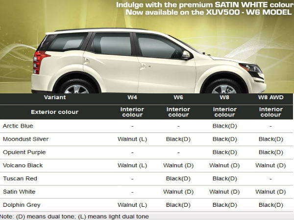 కాగా.. మిడ్ వేరియంట్ అయిన మహీంద్రా ఎక్స్యూవీ500 డబ్ల్యూ6 ఇది వరకు మూన్డస్ట్ సిల్వర్, టస్కాన్ రెడ్, వొల్కానో బ్లాక్ మరియు డాల్ఫిన్ గ్రే కలర్లలో మాత్రమే లభ్యమయ్యేది. తాజాగా ఇందులో శాటిన్ వైట్ కలర్ను జోడించడంతో, డబ్ల్యూ6 వేరియంట్ కలర్ ఆప్షన్ల సంఖ్య ఐదుకుకు చేరుకుంది. అయితే వేరియంట్లో ఆర్కిట్ బ్లూ, ఓప్యులెంట్ పర్పల్ కలర్లు అందుబాటులో లేవు.