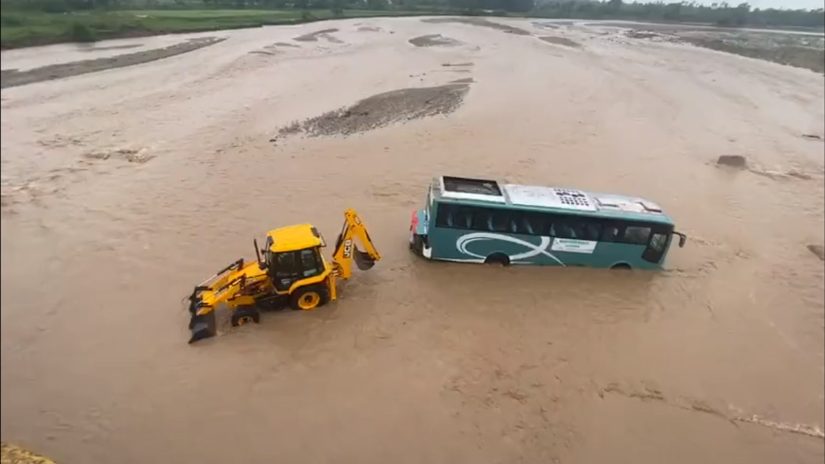 నది వరదలో చిక్కుకున్న బస్సులోని ప్రయాణికులు మోకాళ్ల లోతు నీటిలో నడుచుకుంటూ సురక్షిత ప్రాంతాలకు వెళ్లేందుకు ప్రయత్నిస్తుండటాన్ని వీడియోలో చూడవచ్చు. నది నీటిలో బస్సు పాక్షికంగా మునిగిపోయింది. అధికారులు యాత్రికులను రక్షించిన అనంతరం జేసీబీ యంత్రం సాయంతో నది వరదలో చిక్కుకున్న బస్సును బయటకు తీశారు.