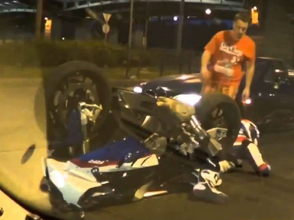 అటూ ఇటూ వాహనాలు వేగంగా వెళ్తున్న రోడ్డుపై ఓ సూపర్బైక్ వెళ్తున్న రైడర్ తనకు అడ్డుగా రాబోయిన రెక్లెస్ వ్యక్తిని తప్పించేందుకు ఎమర్జెన్సీ బ్రేక్ (బహుశా ఫ్రంట్ డిస్క్ బ్రేక్) అప్లయ్ చేయటంతో బైక్ నిటారుగా పైకి లేచి బోర్లాపడిన రైడర్పై బైక్ వెళ్లికిలా పడింది.