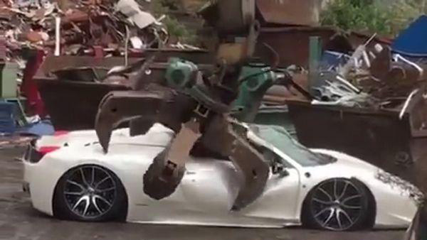ఇంగ్లాండులోని పోలీసులు 3 కోట్ల రుపాయల ఖరీదైన ఫెరారి 458 స్పైడర్ సూపర్ కారును ఏ మాత్రం కనికరం లేకుండా బుల్డోజర్ సహాయంతో నుజ్జు నుజ్జు చేశారు. కారణమేంటో తెలుసా...? రోడ్డు మీద నో పార్కింగ్ ప్రదేశంలో కారును పార్క్ చేశాడని ఇలా చేశారట.
