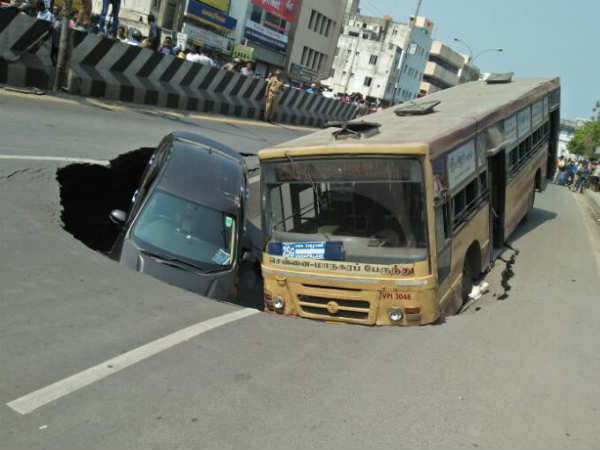 తమిళనాడులోని అన్నా సలాయ్ అనే ప్రదాన రహదారిలో ఉన్నట్లుండి పెద్ద గొయ్యి ఏర్పడింది. రద్దీగా ఉండే ఈ రోడ్డులో ఏర్పడిన గొయ్యిలో తమిళనాడు ఆర్టిసి బస్సు మరియు ఓ కారు ఇరుక్కుపోయాయి.