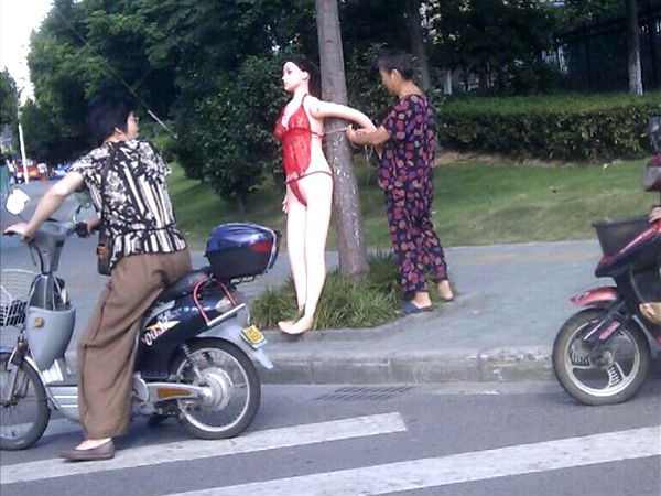 అంతే, వెంటనే షాప్కు ఓ నగ్న స్త్రీ బొమ్మ (సెక్స్ డాల్)ను కొనుక్కు వచ్చి పాదాచారులు రోడ్డును దాటే ప్రాంతంలో ఉండే ఓ చెట్టుకు కట్టేసింది. ఈ బొమ్మను దూరం నుంచి చూస్తే.. అచ్చం అందమైన అమ్మాయిలా కనిపిస్తుంది. అయితే, బామ్మ ఆ బొమ్మను పూర్తి నగ్నంగా ఉంచకుండా, దానికి అరకొర బట్టలను తగిలించింది. బామ్మ ట్రిక్ భలే పనిచేసింది. అటువైపు వెళ్లే మోటారిస్టులంతా తమ స్పీడ్ను తగ్గించి ఆ ప్లాస్టిక్ బొమ్మపై ఓ లుక్కేసి వెళ్తున్నారు. మరి ఈ చైనా బామ్మ ట్రిక్ మీకు నచ్చిందా..?