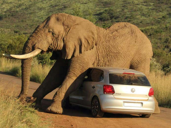 దక్షిణాఆఫ్రికాలోని పిలాన్స్బర్గ్ నేషనల్ పార్క్లో ఫోక్స్వ్యాగన్ పోలో కారులో వెళ్తున్న ప్రయాణీకులకు ఓ ఊహించని పరిణామం ఎదురైంది. కారులోని వారంతా వైల్డ్ సఫారీలో ఉండగా అటుగా వచ్చిన ఓ ఏనుగు తన ముందు రెండు కాళ్లను పొడవుగా చాచి, పొట్టను కారు పైభాగానికేసి రుద్దుకుంది. అంతటితో ఆగకుండా కారు పక్కకు వచ్చి ముఖ భాగాన్ని కూడా కారుకేసి రుద్ది తన దురదు తగ్గించుకుంది.