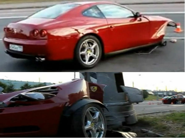 రష్యాలో గత శనివారం వేగంగా వెళ్తున్న ఓ 'ఫెరారీ 612 స్కాగ్లీట్టి' స్పోర్ట్ కారు రోడ్డు పక్కన ఉన్న ఇనుప స్థంభాన్ని ఢీకొట్టి రెండు ముక్కలుగా విరిగిపోయింది. అధిక వేగంతో వెళ్తున్న ఈ కారు అదుపు తప్పి డ్రైవర్ వైపు భాగం స్థంభాన్ని ఢీకొనడంతో కారు ముందు భాగం, ఇంజన్ పూర్తిగా కారు బాడీ నుంచి వేరిపడిపోయి ఆమడదూరంలో పడిపోయింది.