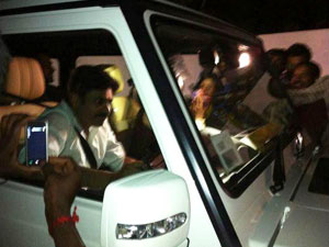 రామ్ చరణ్ నిశ్చితార్థానికి పవన్ కళ్యాన్ హాజరవుతుండగా కెమరాకు చిక్కిన దృశ్యమిది. పవన్ తన మెర్సిడెస్ బెంజ్ జి55 ఎస్యూవీని తానే స్వంతంగా డ్రైవ్ చేసుకుంటూ వచ్చి ఇలా కెమరాలకు చిక్కిపోయాడు. అక్కడికి వచ్చిన అభిమానులంతా తమ తమ ఫోన్లు/కెమరాల్లో పవన్ను బంధించేందుకు ప్రయత్నించారు. విలావంతమైన కార్ల తయారీలో ప్రపంచ ప్రఖ్యాతి గాంచిన ప్రముఖ జర్మన్ లగ్జరీ కార్ల తయారీ సంస్థ మెర్సిడెస్ బెంజ్ గడచిన ఆగస్టు నెలలో ఈ ఎస్యూవీని భారత మార్కెట్లో విడుదల చేసింది.