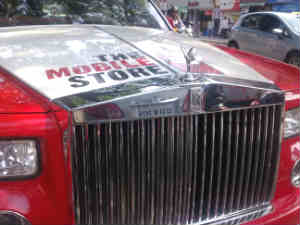 దశాబ్దాల కాలం నుండి రోల్స్ రాయిస్ బ్రాండ్కు ఉన్న క్రేజ్ అంతా కాదు. రాజుల కాలంలో రోల్స్ రాయిస్ కార్లకే పెద్దపీట, మన నైజాం నవాబులు కూడా రోల్స్ రాయిస్ కార్ను ఉపయోగించారు. మరి అంతటి చరిత్ర కలిగిన కారు నేటీ పోటీ ప్రపంచంలో ఇలా మొబైల్ ఫోన్లు అమ్మే కారుగా మారిపోవడం గమనార్హం. నగర రోడ్లపై హల్చల్ చేస్తున్న ఈ మొబైల్ స్టోర్ రోల్స్ రాయిస్ ఫాంటమ్ కారు మా రిపోర్ట్ కెమరా కంటికి చిక్కింది.