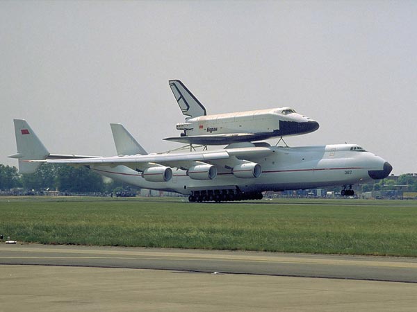 ఆంటనోవ్ ఏఎన్-225 విమానం సోవియట్ కు చెందిన బురాన్ స్పేస్ షటిల్ను మోసుకెళుతున్నప్పటి చిత్రం.