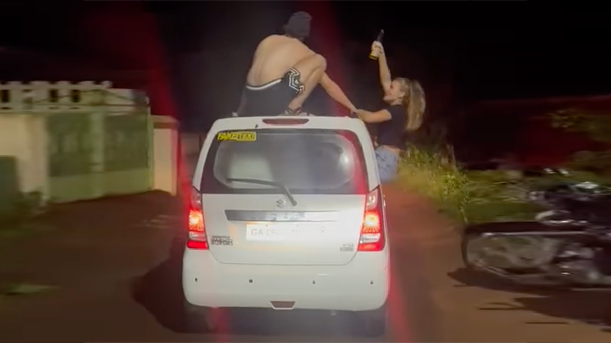 గోవా వీధుల్లో మారుతి వ్యాగన్ఆర్ కారుపైన ఓ యువకుడు కూర్చున్నాడు. కారు కుడివైపు విండోపైన మరో యువతి కూర్చొని ప్రయాణం చేస్తోంది. వీరితోపాటు మరో యువకుడు కూడా ఎడమవైపు కారు విండోపైన కూర్చొని ప్రమాదకరంగా ప్రయాణం చేస్తున్నాడు. వీరి చేతుల్లో మద్యం సీసాలు ఉన్నాయి. వీరి కారు వెనుక ప్రయాణం చేసిన ఓ బైక్ రైడర్ ఈ వీడియోను రికార్డు చేసినట్లు తెలుస్తోంది.