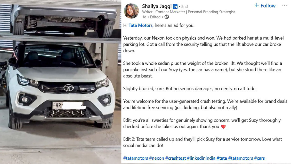 మల్టీ-కార్ పార్కింగ్ సెంటర్లో తన నెక్సాన్పై లిఫ్ట్ పడిన విషయాన్ని శైల్యా జగ్గి సోషల్ మీడియా ప్లాట్ఫామ్ అయిన లింక్డ్ఇన్లో పంచుకుంది. ఇది హర్యానా రిజిస్ట్రేషన్లోని కారు కాబట్టి, ఈ సంఘటన ఢిల్లీ NCRలో ఎక్కడో జరిగి ఉండవచ్చని మనం అనుకోవచ్చు.
