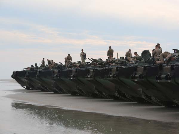 తీర ప్రాంతాల్లో అమెరికా యుద్ద ట్యాంకులు మరియు ఆంపిబియస్ యుద్ద వాహనాలు.