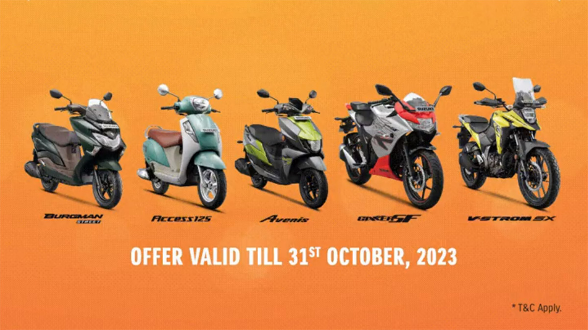 బ్రాండ్ రూ. 5000 వరకు క్యాష్బ్యాక్తో పాటు, స్కూటర్లు మరియు మోటార్ సైకిళ్లపై 100 శాతం లోన్ సౌకర్యం సుజుకి కల్పిస్తుంది. ఇది కాకుండా రూ. 6,999 విలువైన సుజుకి రైడింగ్ జాకెట్ను, మోటార్ సైకిళ్లపై రూ. 7000 వరకు బీమా ప్రయోజనాలను అందిస్తుంది.