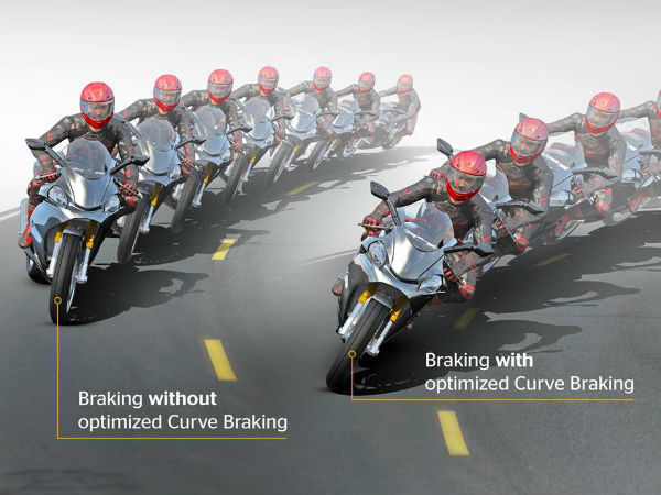 కాంటినెంటల్ ఆప్టిమైజ్డ్ కర్వ్ బ్రేకింగ్ సిస్టమ్ మోటార్సైకిల్ యొక్క రోల్, పిచ్, యాక్సిలరేషన్, లీన్ యాంగిల్ వంటి అంశాలను అంచనా వేసుకొని, మలుపు వద్ద ఉత్తమ బ్రేకింగ్ పెర్ఫార్మెన్స్ను ఆఫర్ చేస్తుంది. సింపుల్గా చెప్పాలంటే, షార్ప్ కర్వ్స్ వద్ద బ్రేక్ అప్లయ్ చేసినప్పుడు టైరు పక్కకు తిరిగిపోకుండా, అది ప్రయాణిస్తున్న దిశ, కోణంలోనే ఆగేందుకు ఈ సిస్టమ్ సహకరిస్తుంది.